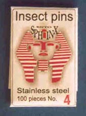 Beschreibung: Insektennadeln, rostfreier Stahl mit Nylonkopf, Gr. 4, 0,55 mm Ø, 38 mm lang.